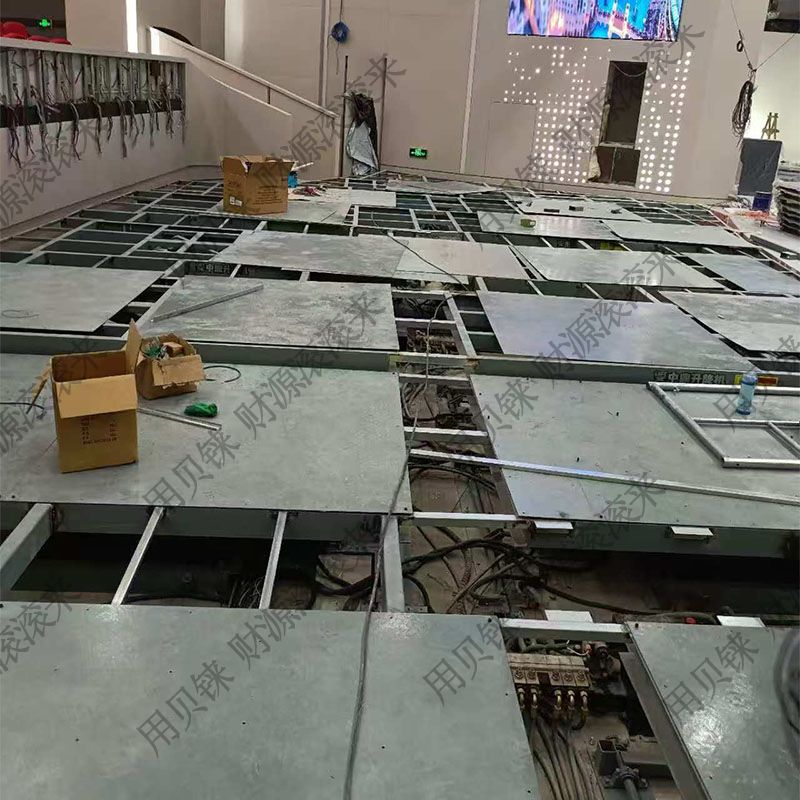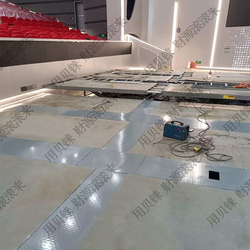 用于转场,台面升高后与室内地面保持水平,20台剪叉式升降平台组成,分成四组同时升降,同步性可靠,升起来后停留时间长不沉降,增减电推杆支撑