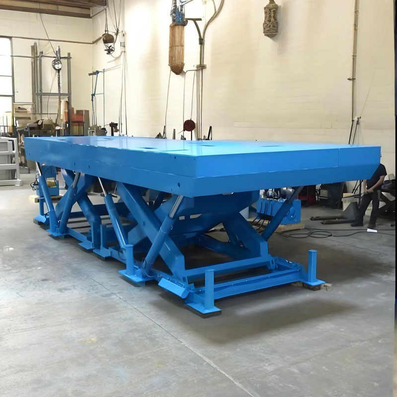 大吨位剪叉液压升降机是一款专为重型设备垂直搬运与装卸作业而设计的高强度升降平台,适用于冶金、能源、模具、汽车制造、船舶工业等对承载能力与稳定性要求极高的工况。设备采用多组高强度剪叉结构,结合大排量液压动力系统,具备出色的承载能力(单台可达20~100吨及以上)与稳定的升降性能。